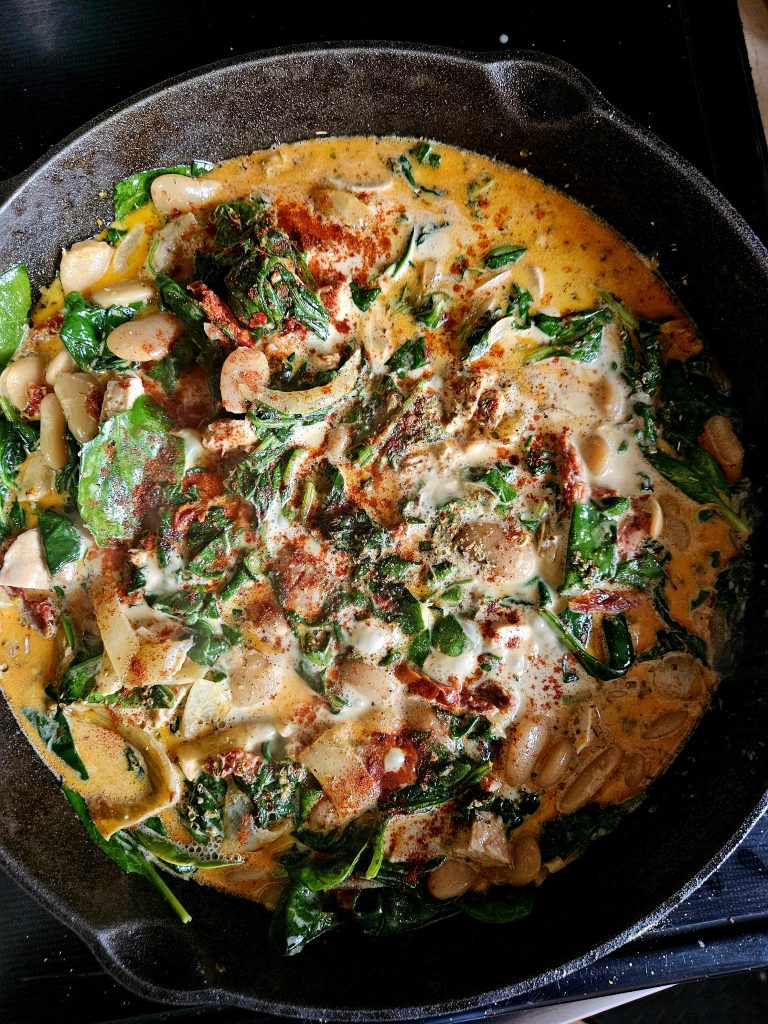 Sauté onion with butter garlic and spices for a few min. Add bag of spinach cooking it down. Add broth, cream, butter beans, sun dried tomatoes, and cook a few min. Add white wine and parm cheese and red pepper flakes and salt to taste. Serve with pasta!
